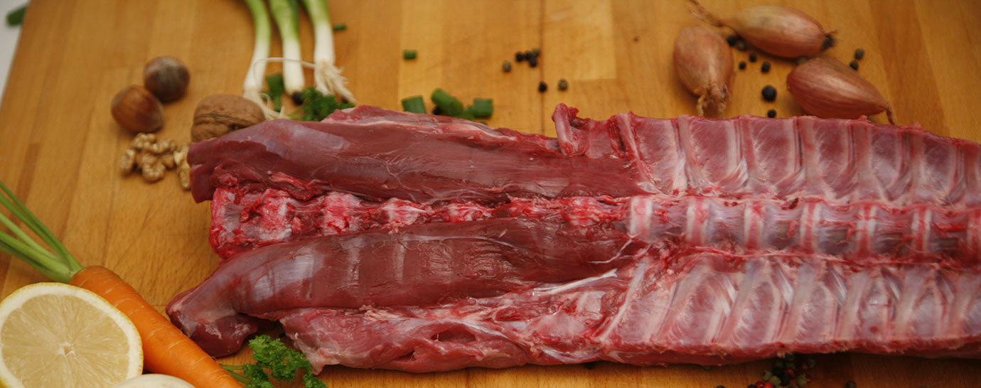 Zarter Rücken vom Rehwild mit Knochen, küchenfertig pariert.