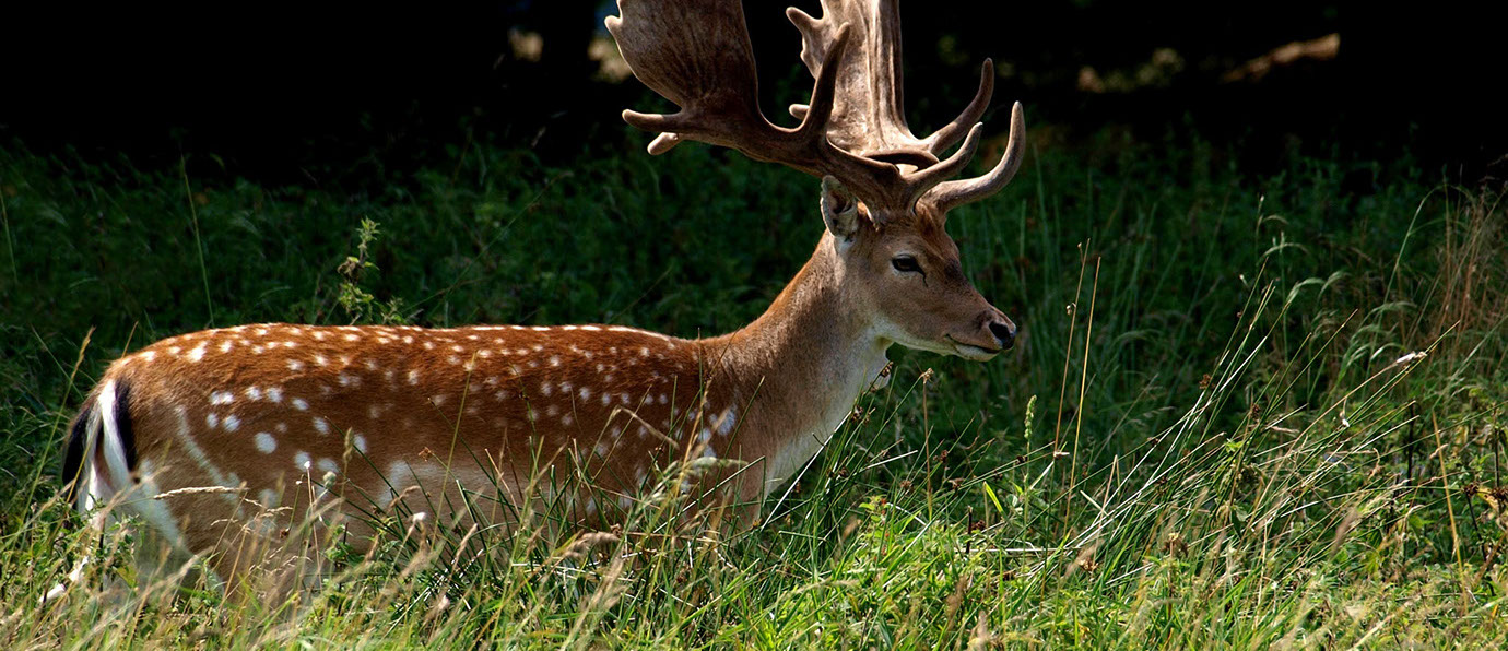 Das Damwild ist ein Paarhufer und gehört ebenfalls zur Familie der Hirsche. Anfangs in ganz Mitteleuropa verbreitet, verlagerte sich der Lebensraum des Damwilds nach der letzten Eiszeit nach Südosteuropa und Vorderasien. Im 16. Jahrhundert erwuchs wieder eine neue Damwild-population in Deutschland aus eingeführten dänischen Zuchtbeständen. Damwild beansprucht eine parkähnliche Landschaft mit einem gleichen Verhältnis zwischen Wald, Feld und Wiesen, kann aber auch mit wenig Waldanteil auskommen. Auffällig ist die typische fleckige Fellfärbung.