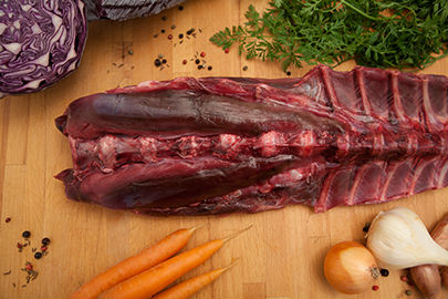 Zarter Rücken vom Rehwild mit Knochen, küchenfertig pariert.